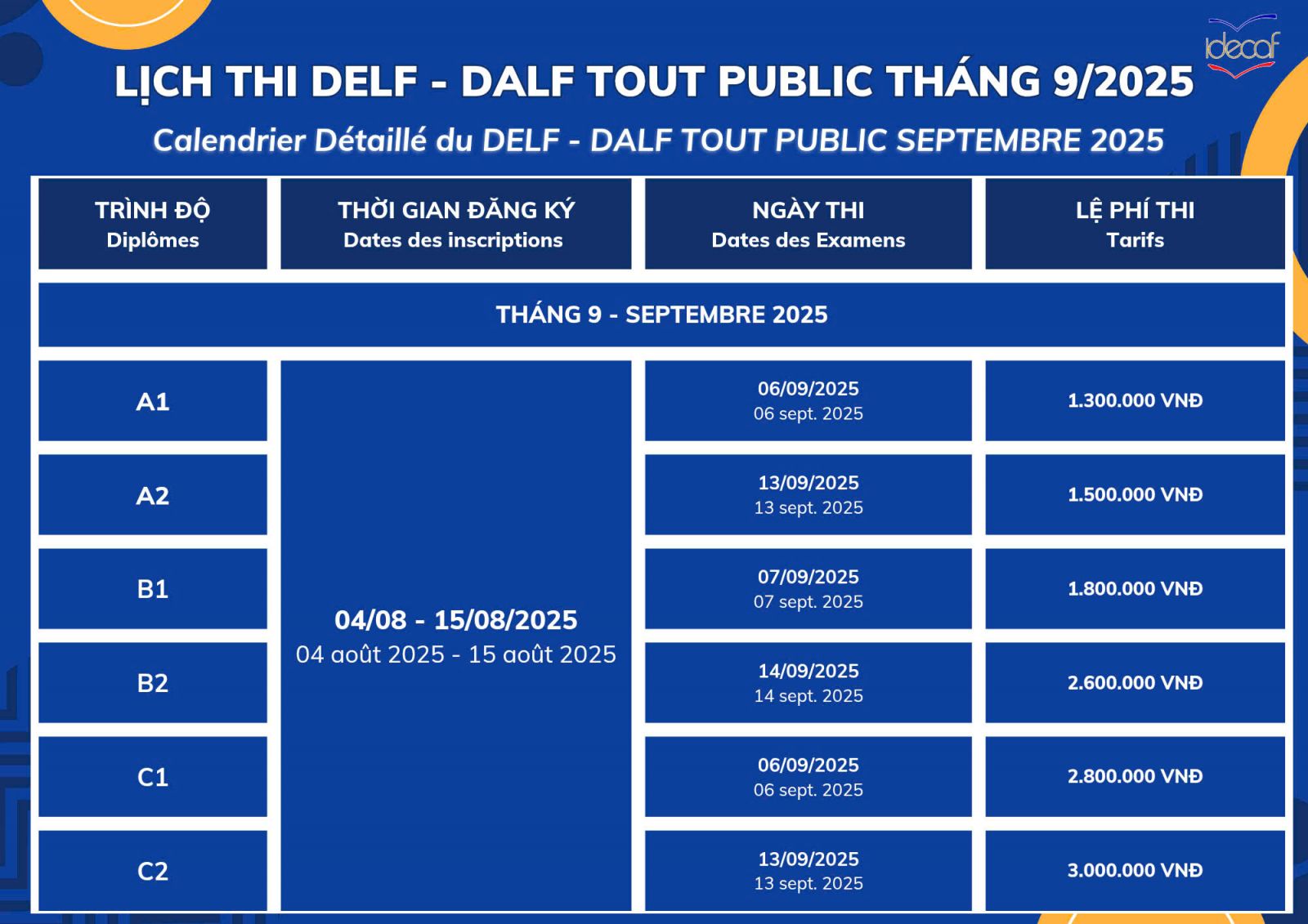 Để chuẩn bị cho kỳ thi DELF TP vào tháng 09.2025 sẽ được tổ chức tại IDECAF, thí sinh có thể bắt đầu tiến hành đăng ký thi từ ngày 04/8/2025 đến ngày 14/8/2025.